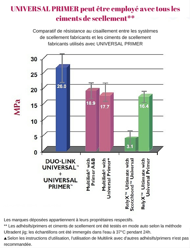 Universal Primer est compatible avec tous les composites de restauration, de scellement et de reconstitution de piliers prothétiques, qu’ils soient photopolymérisables, chémopolymérisables ou dual-cure.